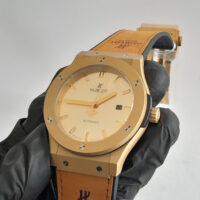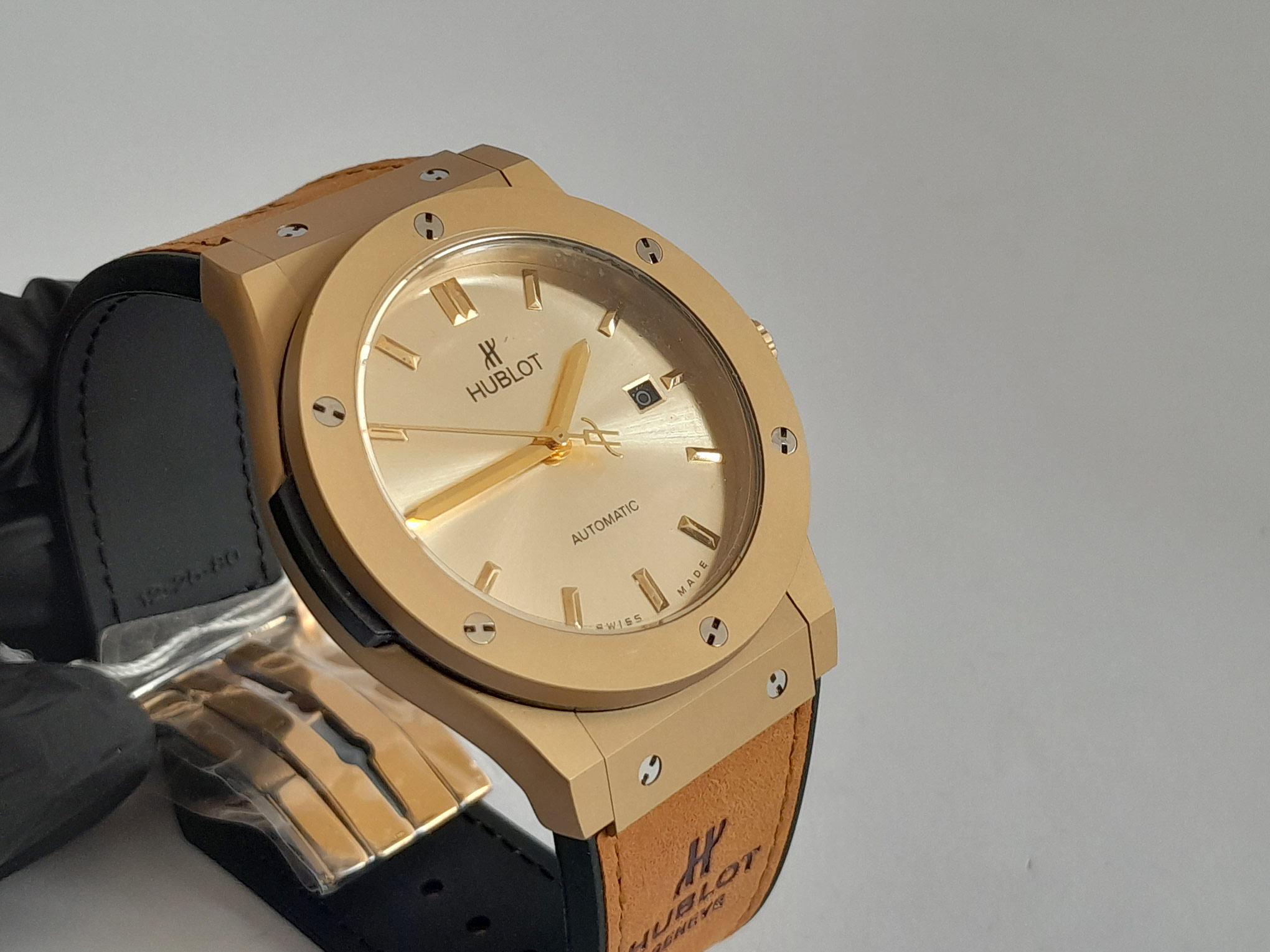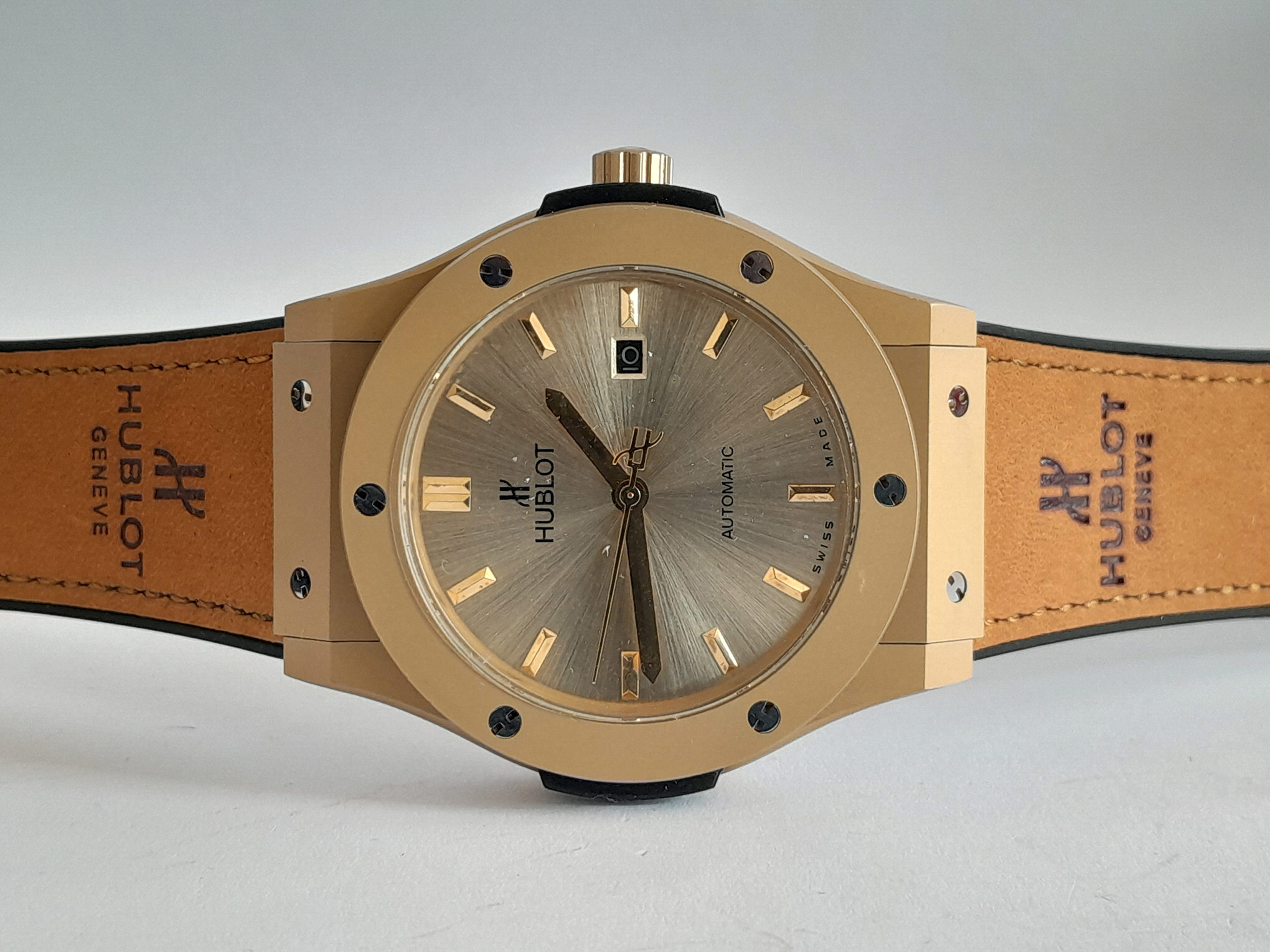 REL HUBLOT FUSSION PIEL CAFÉ MIEL CAJA ORO BISEL ORO C/ORO # LINEAS ORO AUTOMATICO