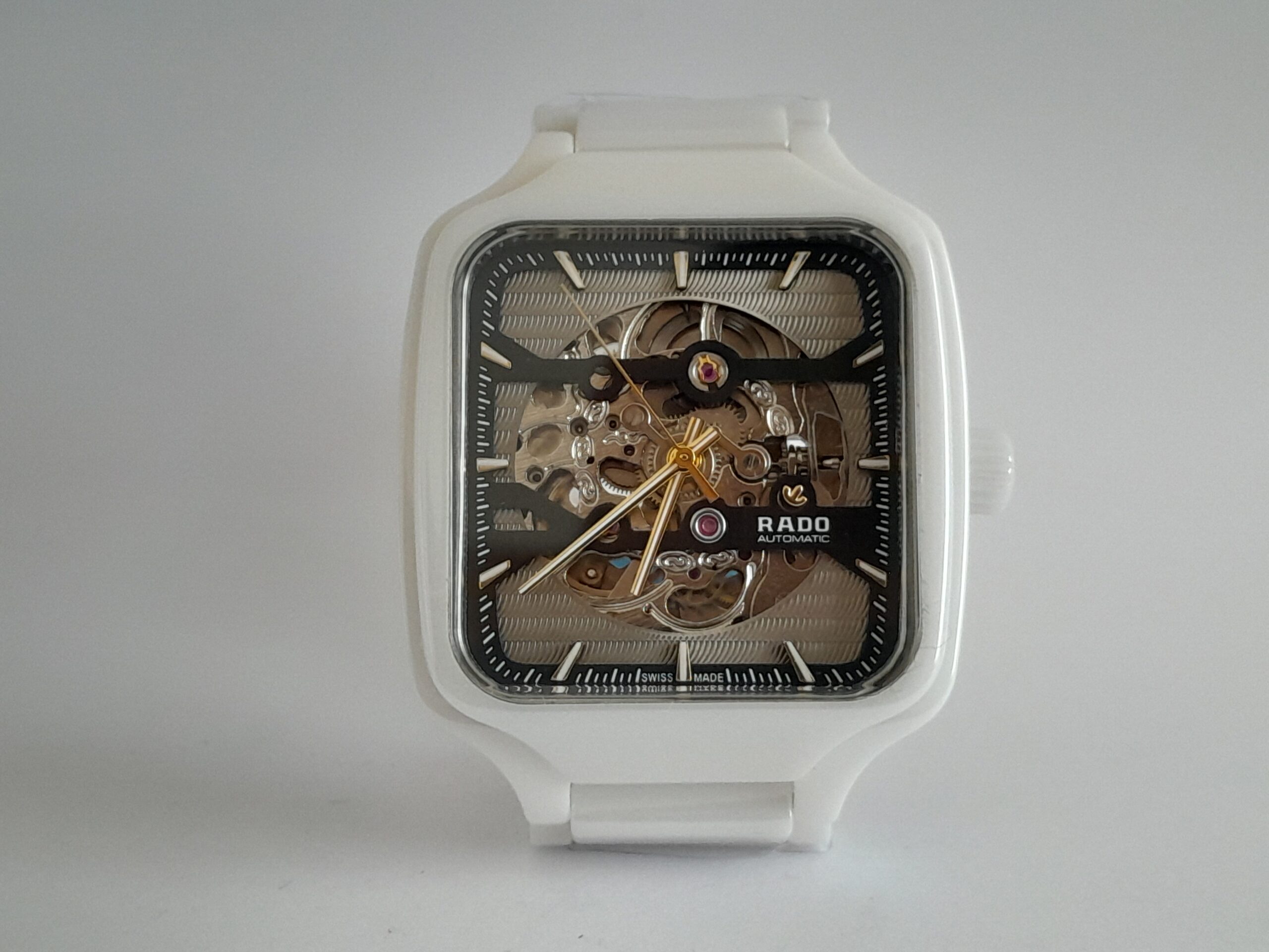 | REL RADO CERAMICA BLC EXT ESLABON BLC CAJA CUADRADA C/NGR ESQUELETOR LINEAS ORO |